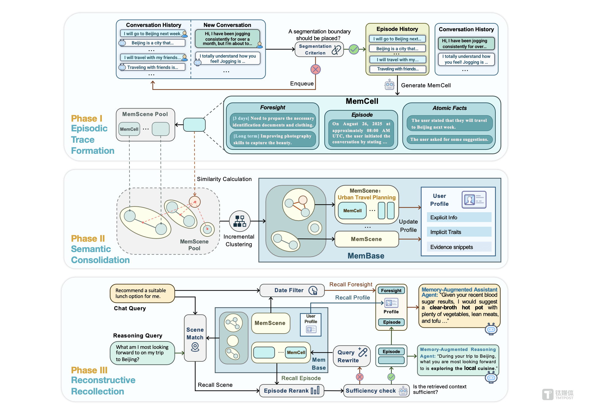 将对话流转换为MemCells,用于捕捉情景痕迹、原子事实以及有时间边界的前瞻信息。