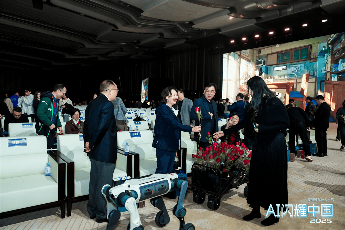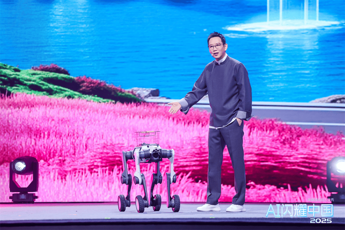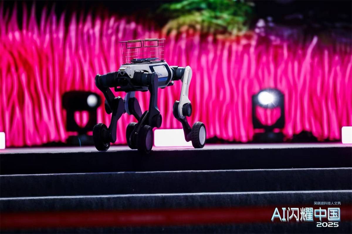 云深处科技山猫M20轮足机器人亮相“AI闪耀中国2025·吴晓波科技人文秀”