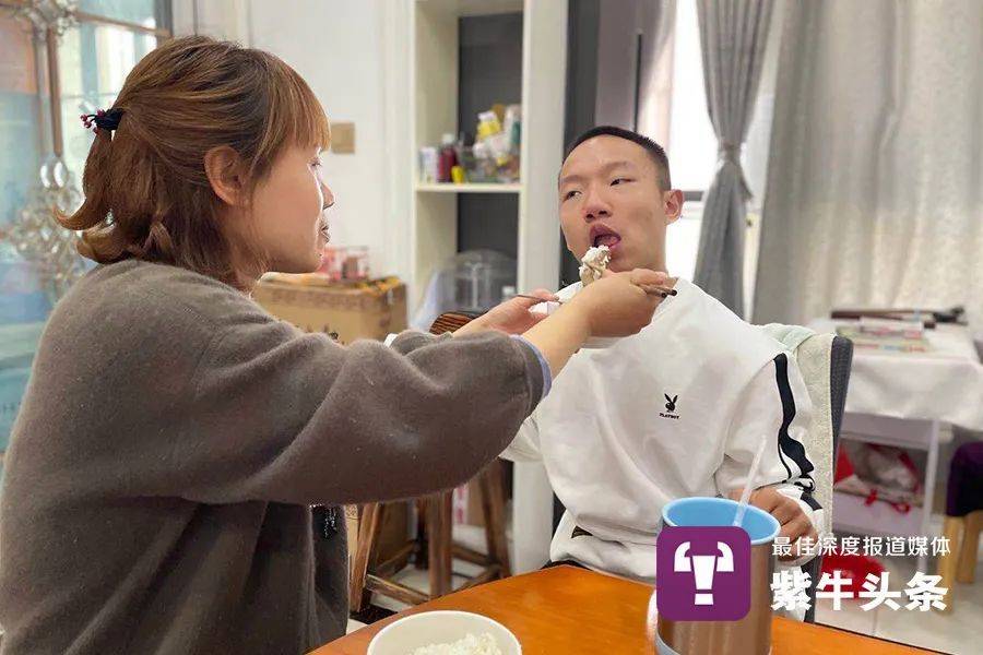 皓皓妈在喂皓皓吃饭皓妈告诉记者,皓皓的体质非常差,每次从山西坐火车回到昆山后都会发烧,发烧后身体状况又会变成治疗之前的样子。“每个周期的治疗都要花三万多元,但是一回昆山他就会发烧,相当于所有的治疗全都白费。”坚持了两个周期后,皓妈决定让皓皓在家进行康复训练。为了避免皓皓长大后走路变成“剪刀腿”,皓妈每天在家为皓皓做两次分腿训练和上肢支撑。“之前在医院治疗时,康复师教过一些基础的康复训练。我按照医院的康复仪器画了草图,找木工做了训练过程中要用的插板和站立架,自己在家给他做康复。”皓妈告诉记者,每次分腿时都要将双腿掰成100度,虽然很痛,但是皓皓从来没有喊过一声疼。