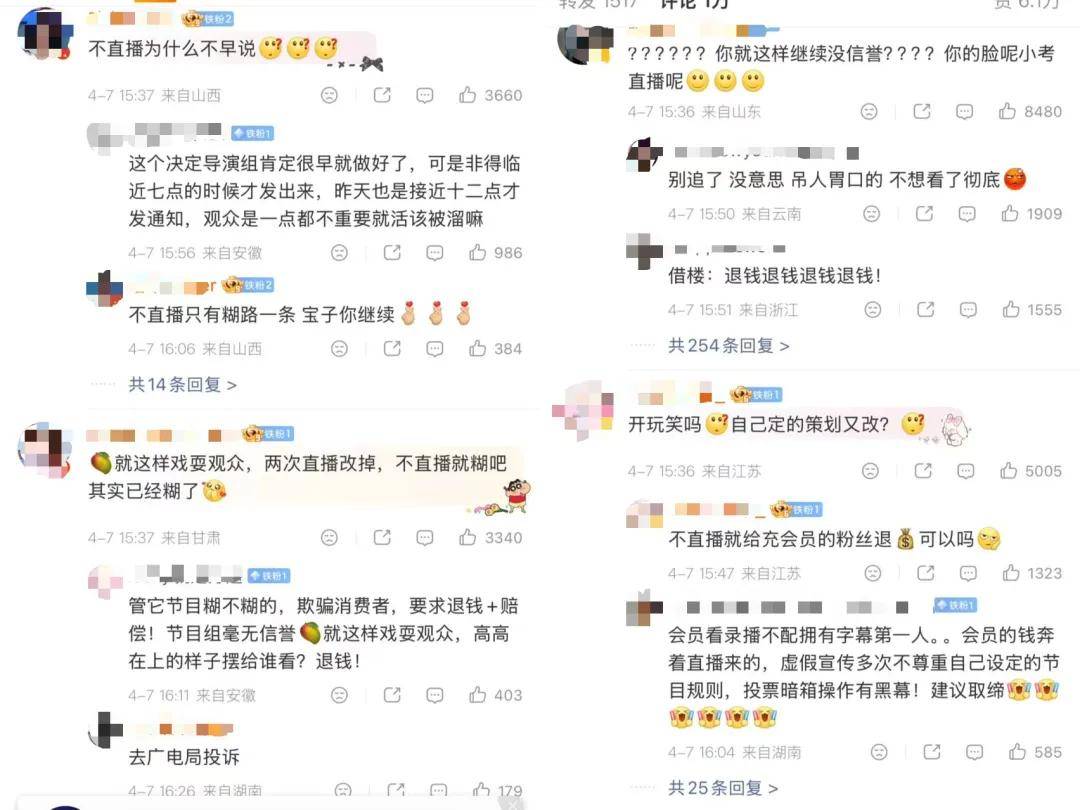 虽然开播热度指向了“爆款”,但是随着4月7日官方微博发布直播推迟一天,并改为录播,消息一出,引发轩然。观众的负面评价集中在:节目以“全程直播”为卖点吸引会员充值,却屡次更改播出形式,疑似节目组存在虚假宣传行为。