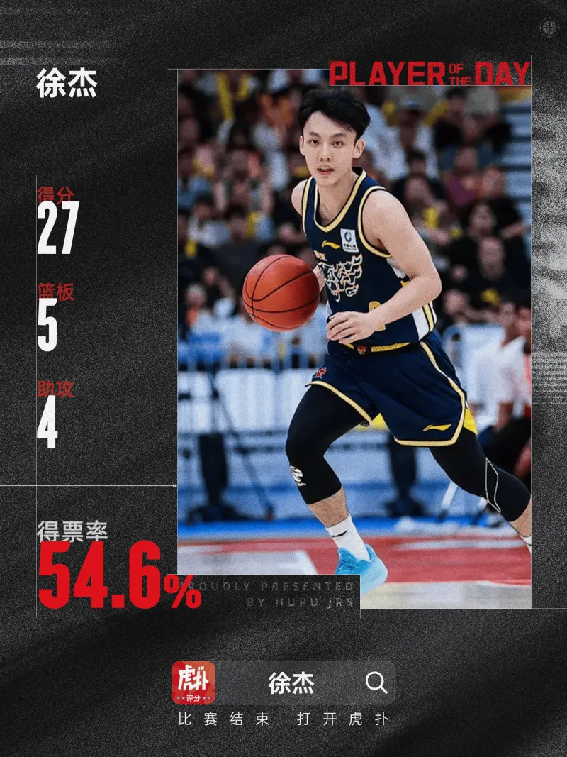广东球员徐杰出战36分钟,投篮20中10,三分11中4、罚球3中3得到27分5篮板4助攻。
