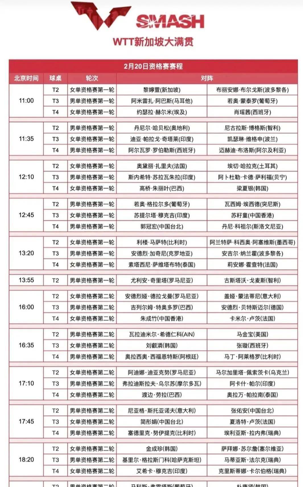 WTT新加坡大满贯:2月20日赛程揭晓!正赛抽签今晚出炉国乒3人位置斗鱼 - 每个人的直播平台【官方指定平台】已确定