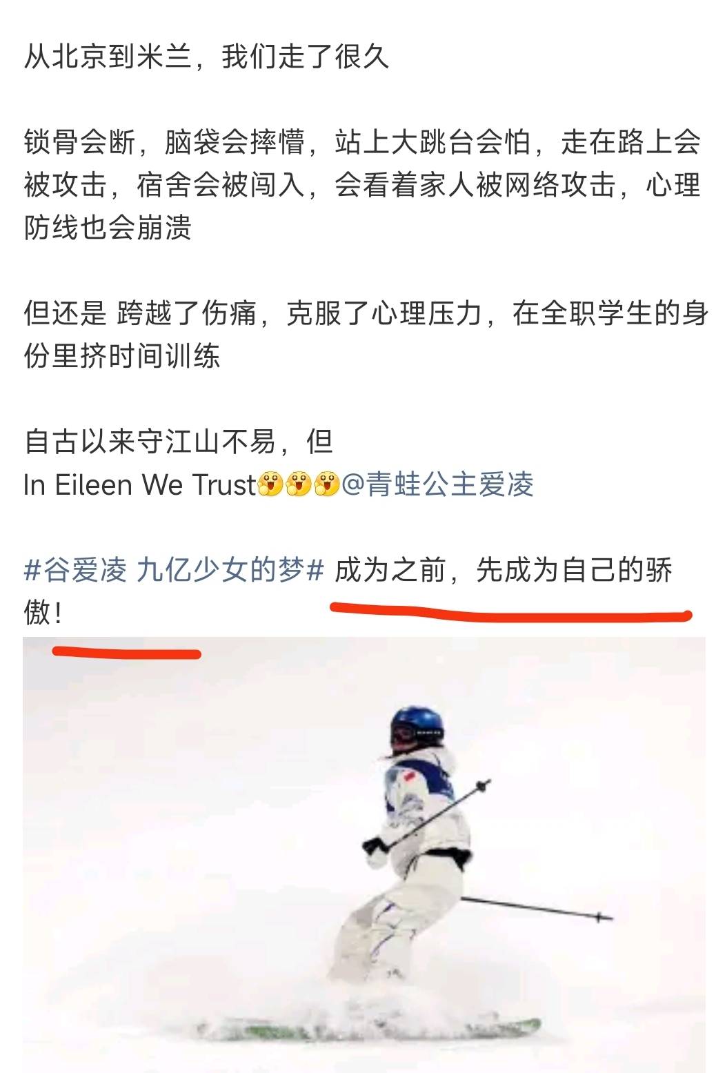 谷爱凌也不是无所畏惧的,从18岁到22岁,谷爱凌怕自己脑袋摔懵,锁骨断裂,站上大跳台,甚至腿也忍不住会发抖。